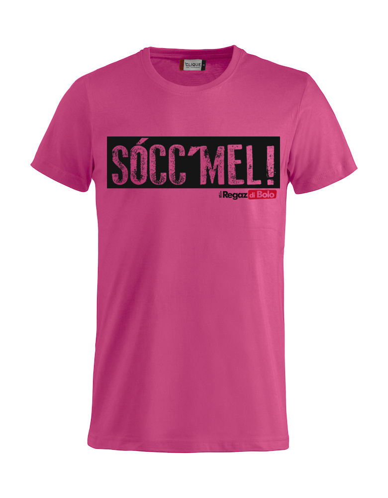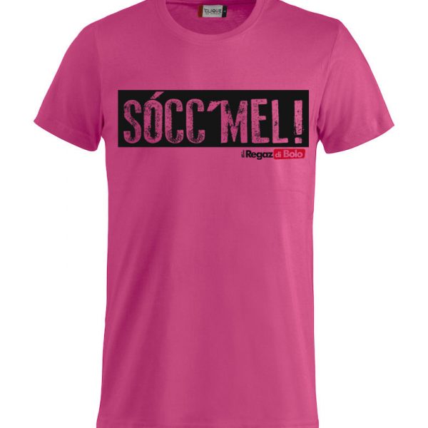 In vendita da Zamboni53 Store per la linea “il regaz di Bolo” la T-Shirt  “SOCCMEL”Lampone con la scritta nera come da foto