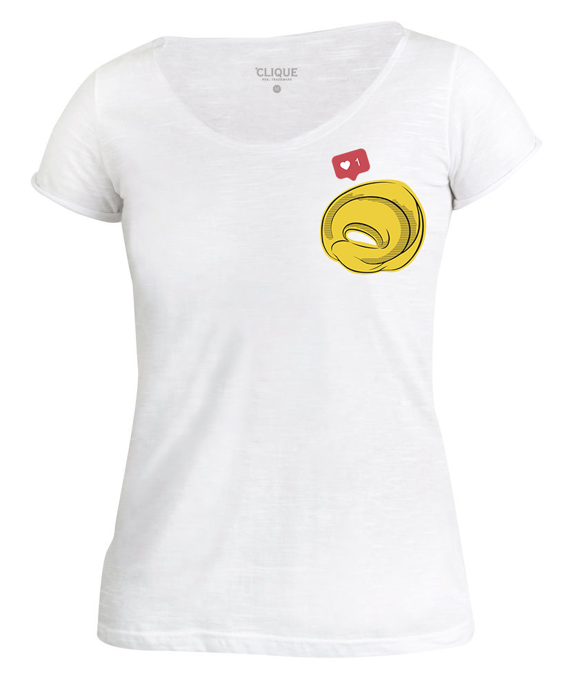 In vendita da Zamboni53 Store per la linea “Il Regaz di Bolo” la T-Shirt da donna con il simbolo del Tortellino Bolognese sul suore e il simbolo del “mi piace” di Instagram.
