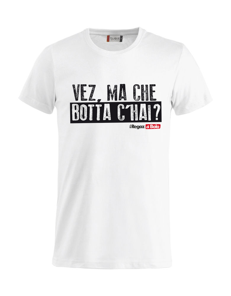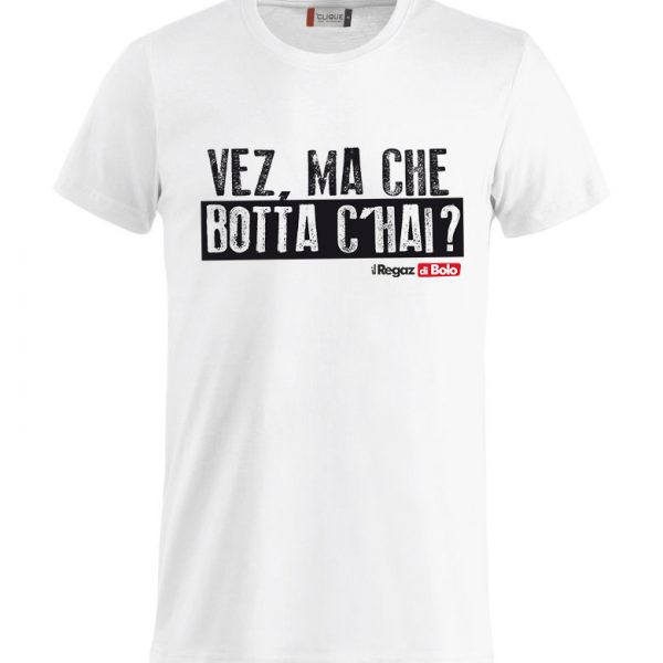 In vendita da Zamboni53 Store per la linea “il regaz di Bolo” la T-Shirt “Vez, ma che botta c’hai? ” bianca con la scritta nera