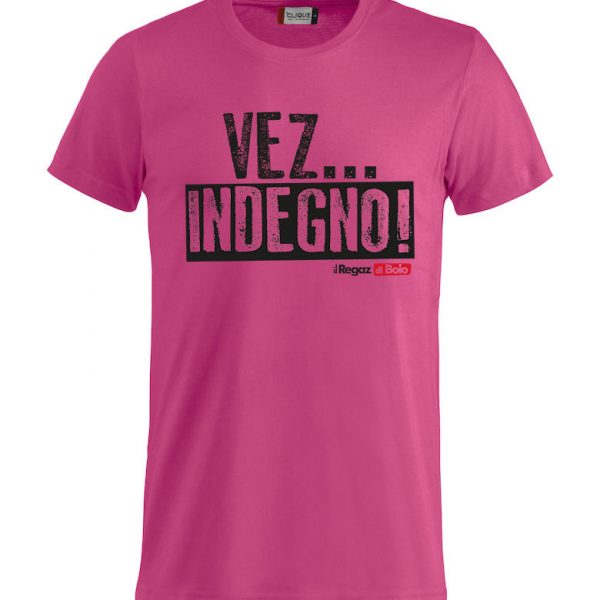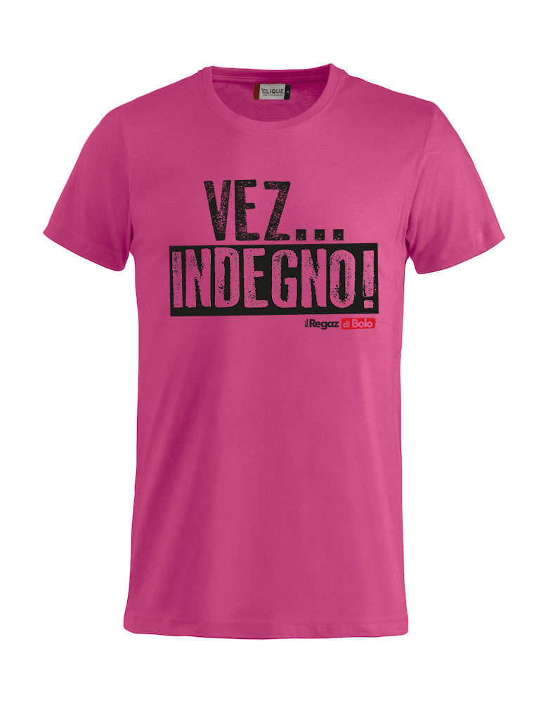 In vendita da Zamboni53 Store per la linea “il regaz di Bolo” la T-Shirt “Vez Indegno”Lampone con la scritta nera come da foto