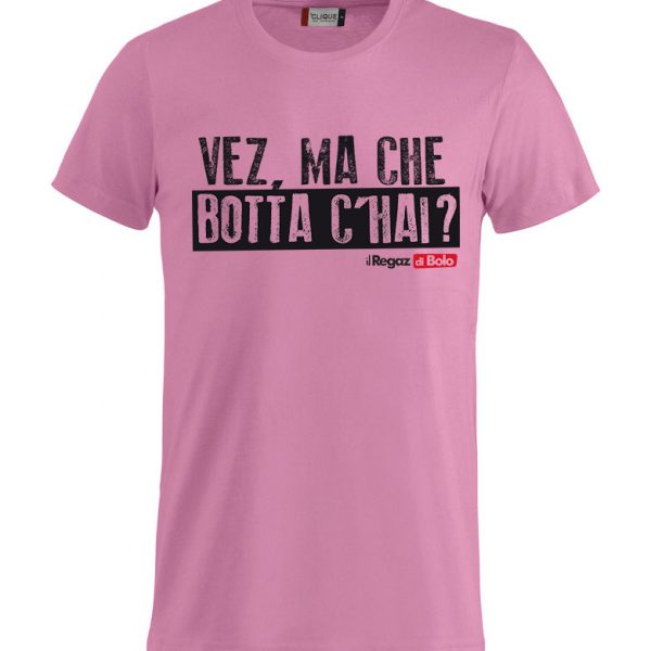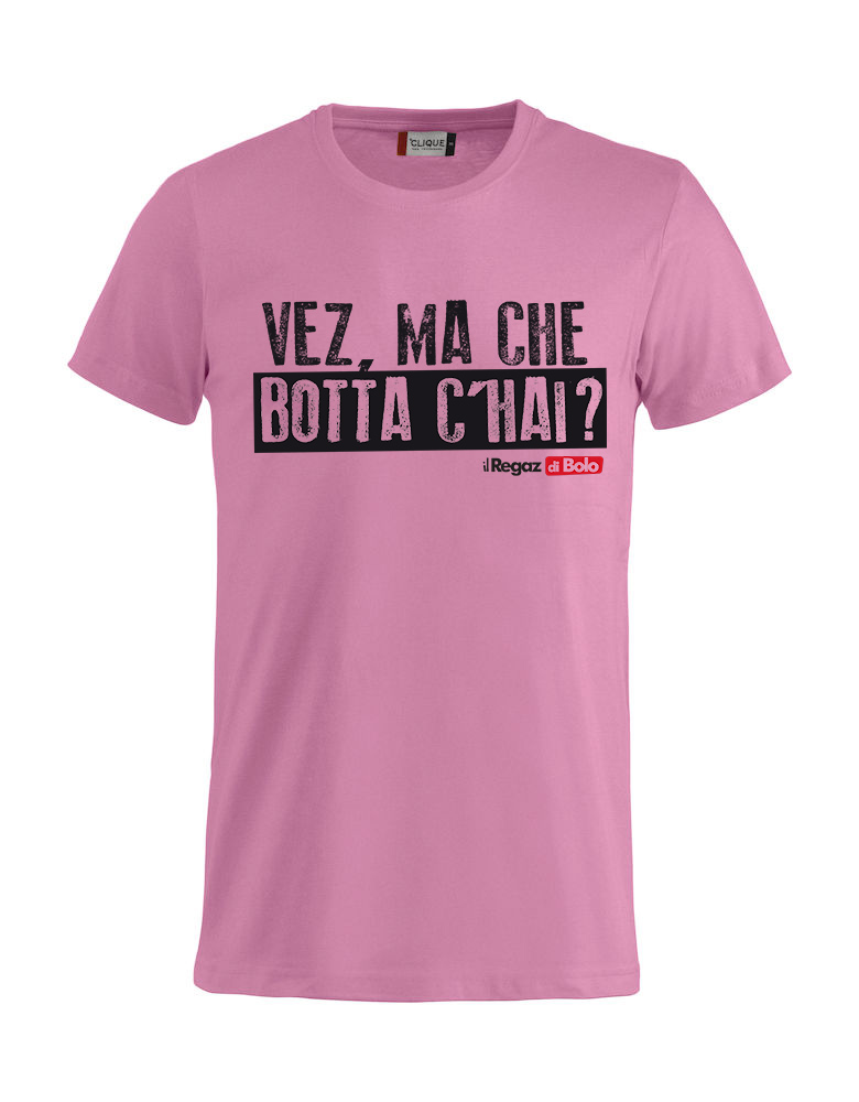In vendita da Zamboni53 Store per la linea “il regaz di Bolo” la T-Shirt “Vez, ma che botta c’hai? ” Rosa Brillante con la scritta nera