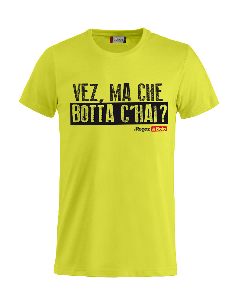 In vendita da Zamboni53 Store per la linea “il regaz di Bolo” la T-Shirt “Vez, ma che botta c’hai? ” Verde Intenso con la scritta nera