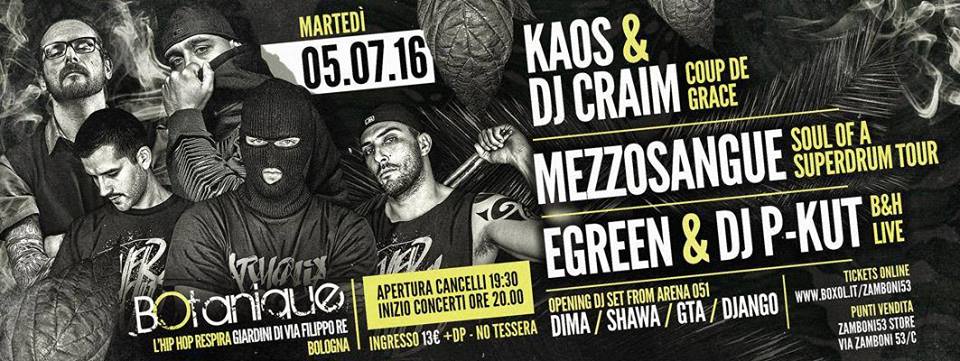 Sbarcano nel giardino del BOtanique per la prima volta a Bologna insieme KAOS, MEZZOSANGUE, E-GREEN per una data estiva all’aperto da non perdere: Mezzosangue ritorna a Bologna in tour inedito “Soul of superdrum tour” insieme al prodigioso batterista Luca Martelli (Litfiba) & dj Ernest Powell; sul palco Kaos, che non ha bisogno di presentazioni, accompagnato da uno dei dj pi˘ acclamati della penisola Dj Craim presentano il nuovo lavoro “Coup De Grace”, sul palco anche E-GREEN uno dei maggiori esponenti dell’Hiphop nostrano che presenta assieme a Dj P-Kut (vincitore DMC ITALI) l’energico e fresco “Beats & Hate”
