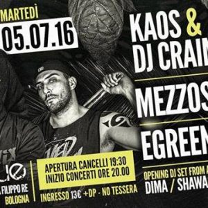 Sbarcano nel giardino del BOtanique per la prima volta a Bologna insieme KAOS, MEZZOSANGUE, E-GREEN per una data estiva all’aperto da non perdere: Mezzosangue ritorna a Bologna in tour inedito “Soul of superdrum tour” insieme al prodigioso batterista Luca Martelli (Litfiba) & dj Ernest Powell; sul palco Kaos, che non ha bisogno di presentazioni, accompagnato da uno dei dj pi˘ acclamati della penisola Dj Craim presentano il nuovo lavoro “Coup De Grace”, sul palco anche E-GREEN uno dei maggiori esponenti dell’Hiphop nostrano che presenta assieme a Dj P-Kut (vincitore DMC ITALI) l’energico e fresco “Beats & Hate”
